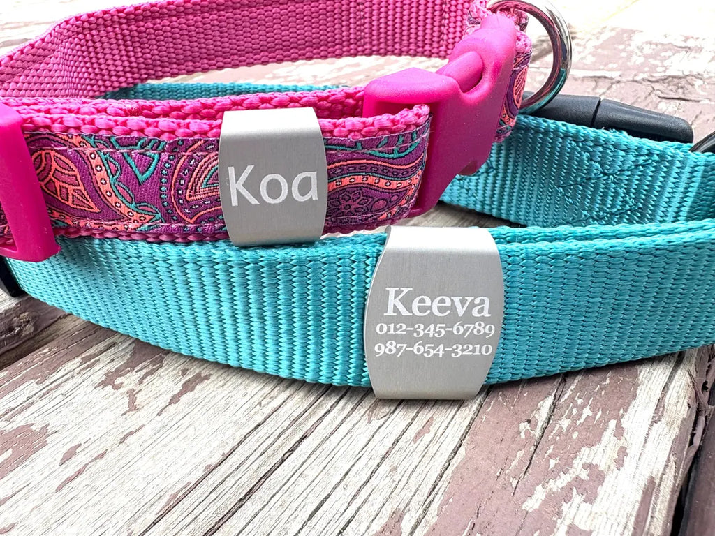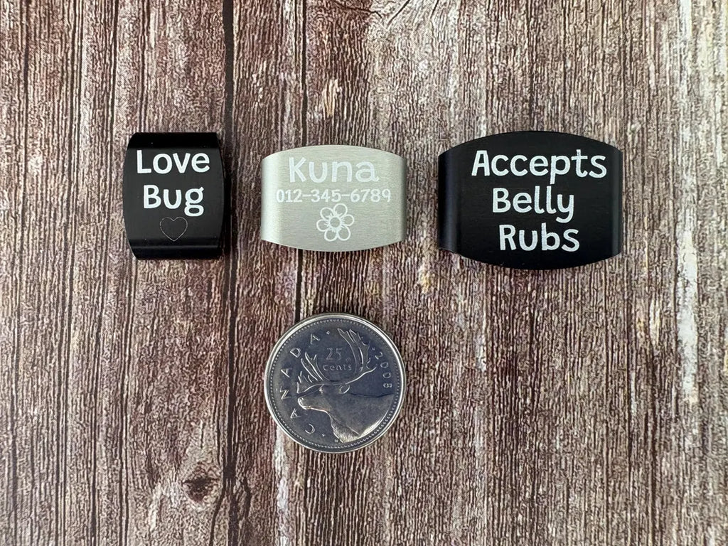 Say goodbye to jingling collars and fiddly hardware! Our silent dog tag is the perfect solution for pet owners who want peace and quiet without sacrificing safety. Crafted from lightweight, durable anodized aluminum, this custom pet ID tag is completely noise-free, and attaches securely without a split ring. This makes it quick and easy to use, and less likely to fall off during play or walks. This listing is for vertical engraving as seen in the photos. *See below for personalization instructions*